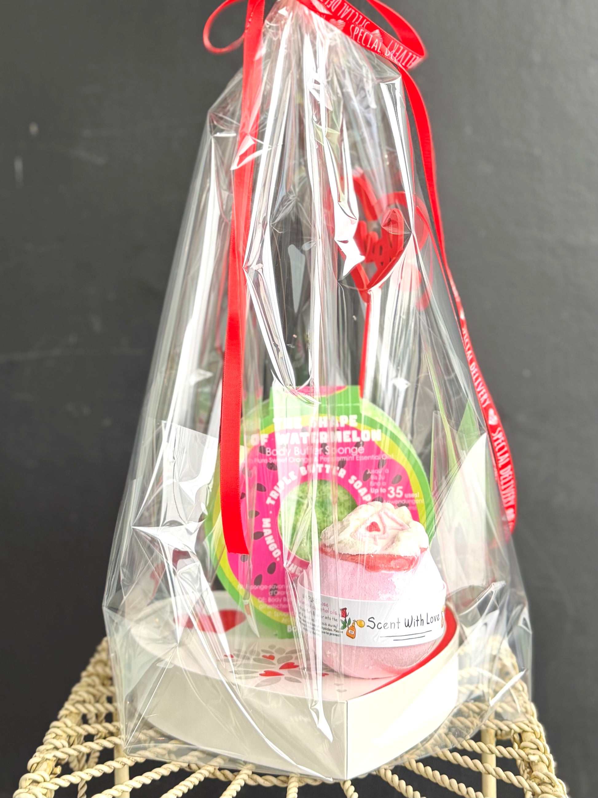 Chocolates, Bath bomb, Body buffer sponge, Love pick